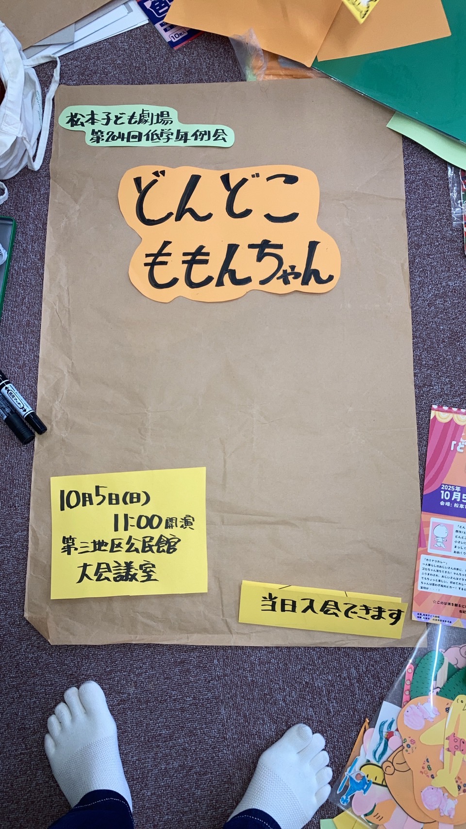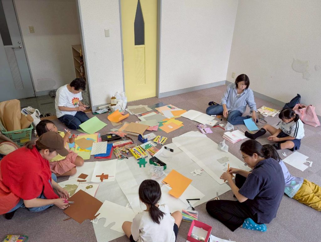どんどこどんどこ、みんなで工作! 2025年9月27日 最終更新日時 : 2025年9月28日 denden_test 2025/9/21(日)松南地区公民館で、「どんどこももんちゃん」の当番会を行いました。低学年例会なので、お当番さんも幼児~小学校低学年の親子が中心です。いつもは会議室で話し合いを行いますが、この日はじゅうたん敷の部屋でダイナミックに工作などを行いました。役割も決まって、あとは当日のお楽しみ♪体調に気をつけて、10月に元気に集まりましょう~! ももんちゃんの絵本を見ながら工作 当日に使う看板もリニューアル☆ 空いているところは、当日飾ります!お楽しみに♪